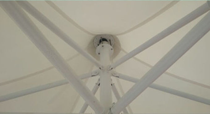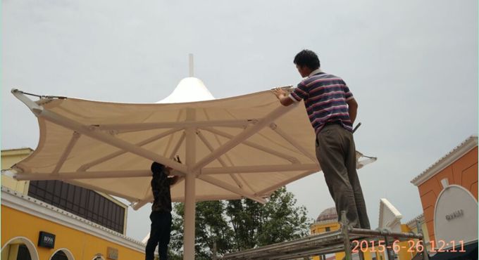 武漢百年奧特萊斯廣場冒頂六邊休閑景觀傘膜結(jié)構(gòu),該項目為永久式景觀遮陽傘,其結(jié)構(gòu)為內(nèi)撐式冒頂膜結(jié)構(gòu),單帽單立柱支撐,該項目每個都為單個冒頂形式,pvdf建筑膜材裁剪為單帽頂張拉,對施工工藝、精度要求高,其尺寸不受限制,可大可小,可單冒頂,也可無限連帽,為了結(jié)構(gòu)的完美,冒頂裝飾可根據(jù)現(xiàn)場環(huán)境和結(jié)構(gòu)需要設計,該冒頂采用立桿圓盤六邊設計,美觀而實用。一直是客戶的首選景觀傘膜結(jié)構(gòu)造型之一。